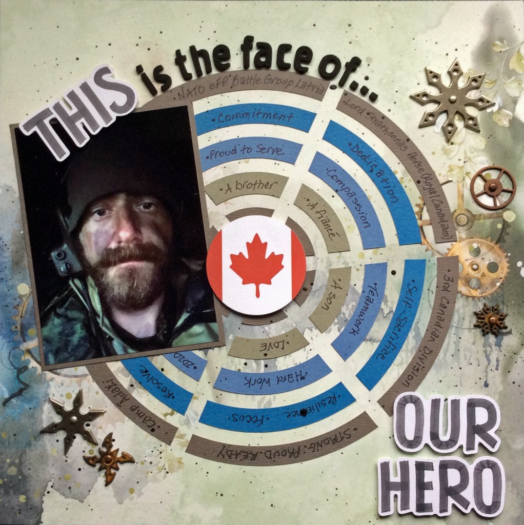 The foundation for this page was a patterned paper called Rain Storm from the Serendipitous collection from 49 Market (I’ve had it in my paper stash for some time). I used a free cut file from Paper Issues called “Right on Target”. However, I choose to use the negative space in the cut file, and cut each circular section from coordinating cardstock papers, providing a great space to journal. The circular Canadian flag came from the O Canada, embellishment collection by Photoplay. The metal accents are a combination of Tim Holtz’s “sprocket gears” and Finnabair’s Mechanicals “Steampunk Blades”. Before adding the title, I splattered the layout with black paint to create a weathered look that would match feel of the photo. I created the title by combining the large words from a Cocoa Vanilla collection with black Thickers.