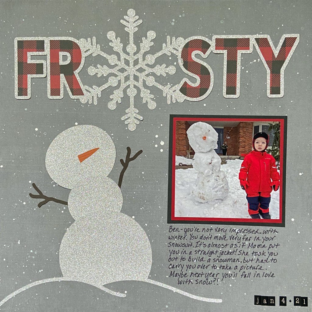 The patterned paper for this layout was a mix of two Photoplay collections. The solid grey cardstock came from the Christmas Cheer “Solids Plus” collection pack, and the red and black lumberjack paper, that backs the Frosty title, came from the “O Canada” collection pack. I choose the red and black lumberjack paper because it matched the fabric of Ben’s hat, and I chose the grey cardstock for two reasons; it was a grey overcast day, and it fit the mood of my grandson!