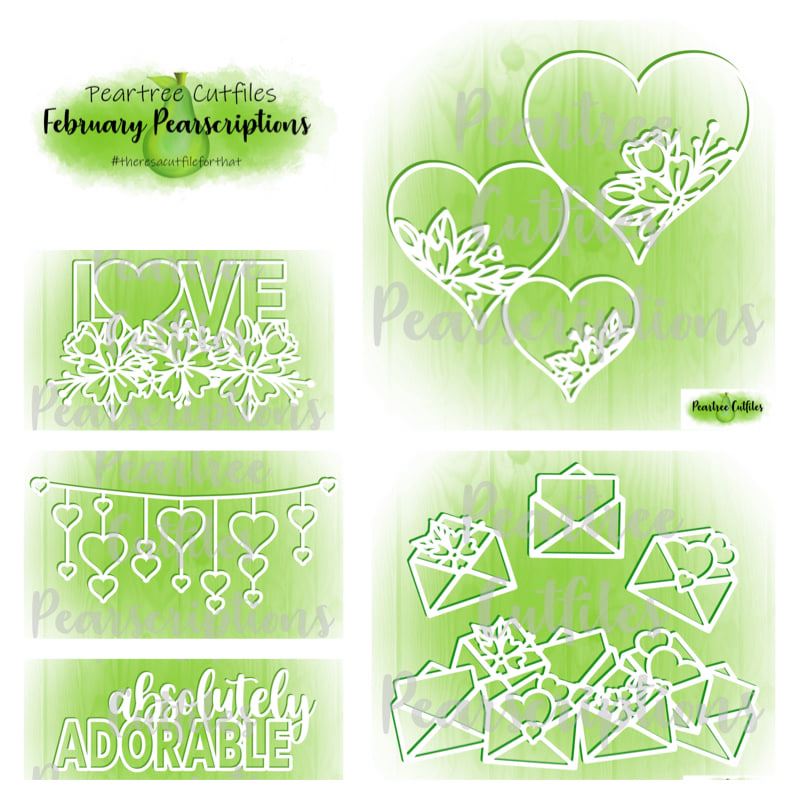There are 4 cut files used in this layout, and they were each sized to fit within the green squares. They all come from Peartree Cutfiles https://www.peartreecutfiles.co.uk/, however, a couple of these files (Love and String of Hearts), are exclusive files from my Peartree monthly subscription https://www.peartreecutfiles.co.uk/pearscription/. The monthly subscription is an excellent value and you’ll receive 5 exclusive cut files that will never be available in the shop. Additionally, you also receive the free cut file of the month, for a total of 6 cut files. The Oh So Special cut file was the free cut file of the month in February, you can now purchase it in the shop. The fourth file used is called Shelf of Hearts and is also available for purchase in the shop. Each of the cut files was backed with patterned papers from Vicki’s Storyteller collection. Here are pictures of the cut files used.