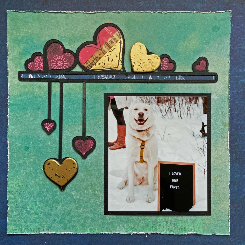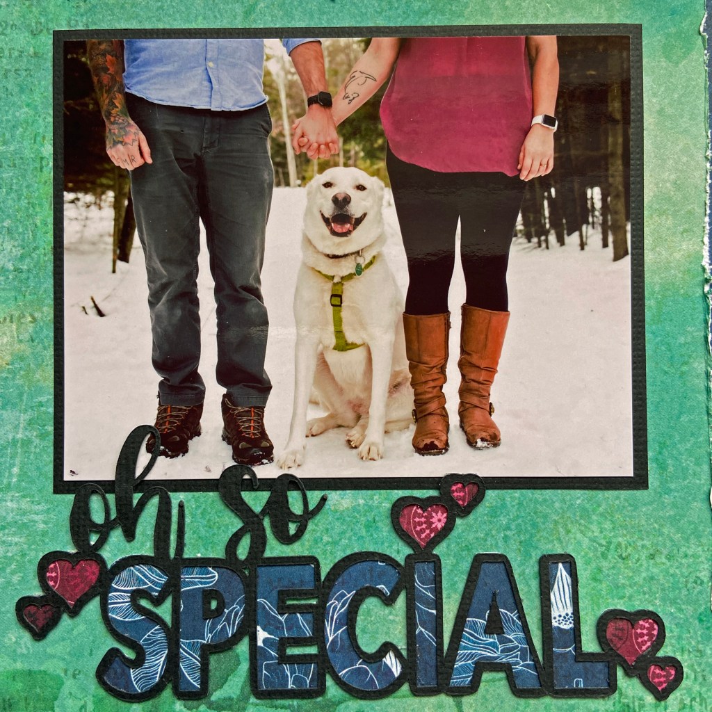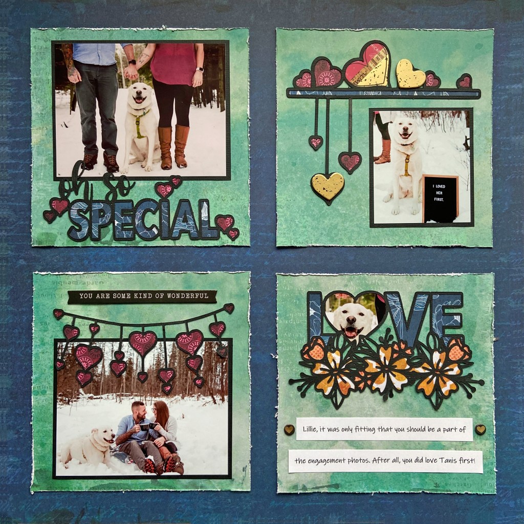 Sean and Tanis met after he returned from his first deployment in 2017 (and boy, are we glad they did!). Tanis is a huge pet lover, and she had a cat, Stella, and a dog, Lillie when they met. Sean had to win over more than Tanis in this relationship! As you can see from the pictures in the layout, he had no trouble doing so. Lillie is a gentle, loving animal, and I think she loves Sean now as much as she loves Tanis! She is a mix of Siberian Husky/Malamute and Maremma Sheepdog. Tanis shared “She liked him right away, but when we first started dating, every time we hugged she would stand beside us and whine or groan or grumble, and when we walked she would always try to walk between us. That’s the Maremma in her, guarding me, but Sean won her over with treats, hugs and chasing her in the backyard and the arena; she learned the sound of his car and loses her mind when she hears it up the street. One time, he drove by us while we were walking back to his apartment, so she (and in turn, I) chased his car back because she was so excited. Now she guards both of us and whines, groans and grumbles when we’re not in the same room together.” Lillie is such a big part of their lives, she needed to be part of their formal engagement photos. While I’ve scrapped several of the engagement photos already, I wanted to make sure that Lillie had her spotlight as well. This layout helped me achieve this.