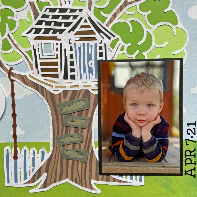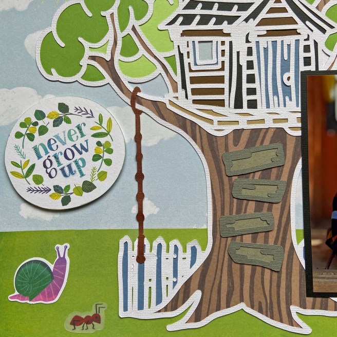While it does take some time and patience to back this large cut file, it was worth all the effort. I used patterned papers for the background and the tree trunk from Shimelle’s Never Grow Up paper line. I also used a Copic marker to colour the rope ladder found to the left of the tree trunk. When I’m working on a cut file this large, I use the fill option in the Silhouette Studio software to map out the colours first. This ensures I don’t miss any of the pieces as I cut the backing, and also speeds things up overall.