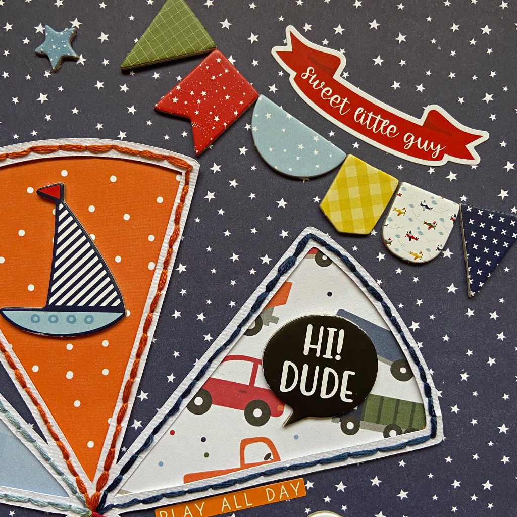 My first step in creating this layout was to resize the Pie Graph cut file and then cut it from white cardstock. I used the Little Dreamer Boy paper collection and chipboard accents from Echo Park to complete this layout. The star background is the backside of the Little Dude patterned paper. I then decided which coordinating papers I would use to backfill the pie graph, and cut those accordingly. These pieces were set aside at this stage. To add some texture and dimension to the page, I hand stitched each section of the pie graph in a coordinating colour using DMC floss. The specific colours used in this layout were 336, 522, 816, 921, and 932. To prepare the cut file for stitching I took a paper piercer and pierced holes approximately 1/4″ apart around each section of the cut file. A simple backstitch was used to complete the stitching. When all the stitching was completed the coordinating patterned papers were adhered to the back of the cut file to complete the pie graph. The completed cut file was then positioned and adhered to the background paper.