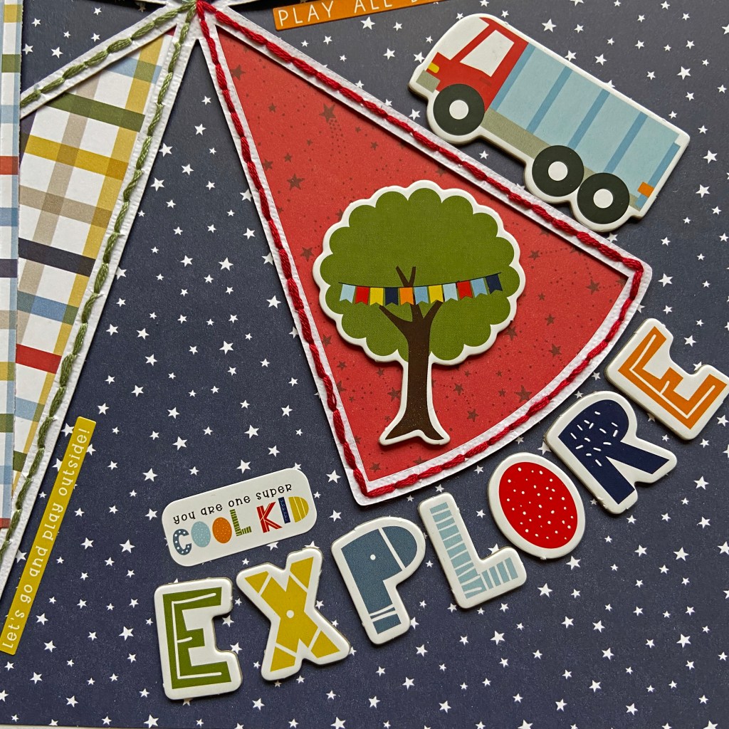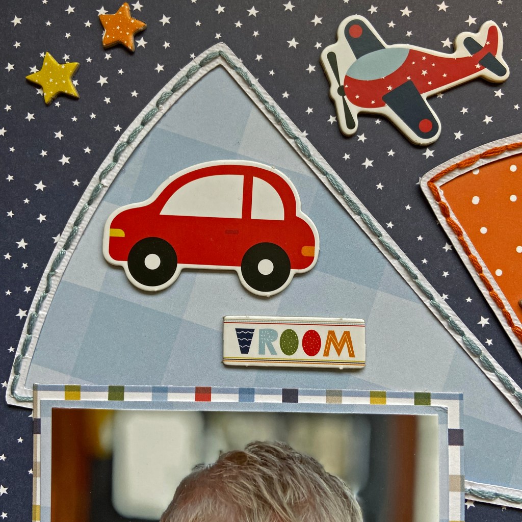 Once the cut file was completed and in place, the layout came together quite quickly. Two patterned papers were used to mat the photo. The coordinating elements on this layout came from the Little Dreamer Boy 12 x 12 Element Sticker sheet and the Chipboard Accents. The date was added with white Happy Life Thickers, by American Crafts. Here are some further closeups of the detail in this layout.