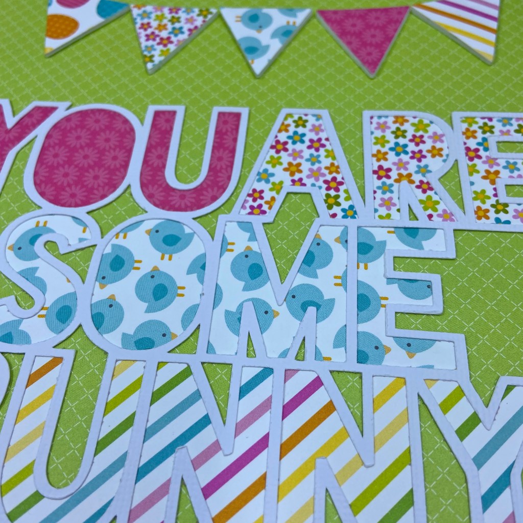 Coordinating papers from 3 separate Doodlebug Designs collections were used to complete this layout; Springtime, Hello Spring and Easter Parade. Two cut files were used to create this fun page. The large title cut file comes from Cut to You and is called Some Bunny Special. You can find it here https://createdbygwen.com.au/product/some-bunny-special-title-cut-file/. I selected 5 coordinating patterned papers from the 3 collections listed above to back the title and add further whimsy to the layout.