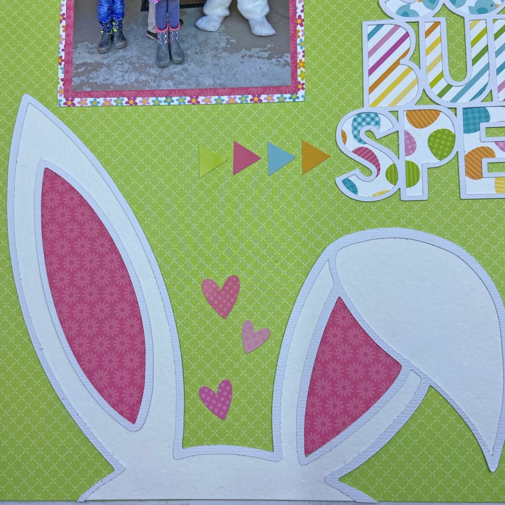 The finishing touches on the layout included adding sticker hearts (between the bunny ears) and sticker arrows to the left of the word SPECIAL in the title. The photo was matted with 2 coordinating patterned papers. The journaling found in the bottom right was printed on white cardstock and cut to size. These strips were also backed with fun foam. The 3 hearts found at the end of the journaling come from the Rainbow Hearts Shape Sprinkles by Doodlebug Designs. The date was added using Doodlebug stickers called Sunshine.