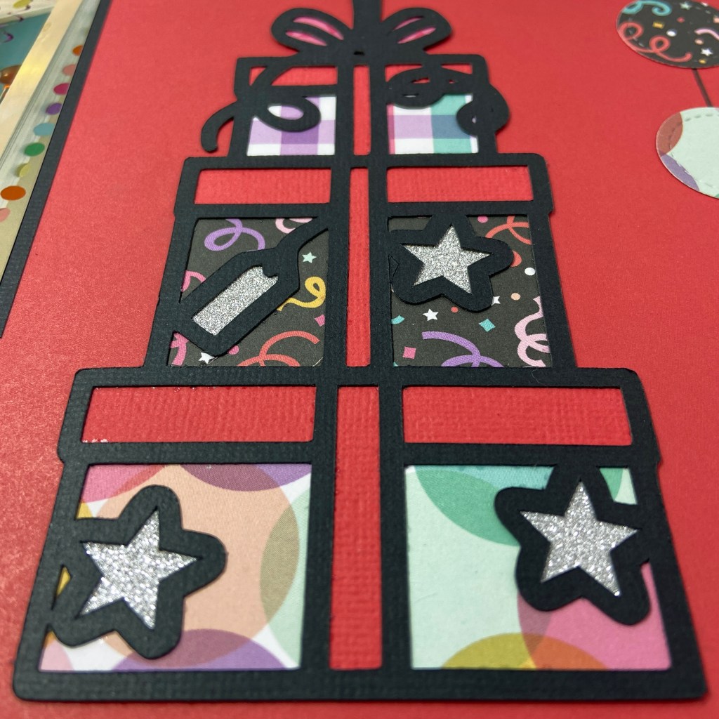 Both of these files have stars in them which further coordinated with the background paper. Each file was backed with coordinating patterned papers from the It’s Your Birthday paper collection. The stars were all backed with silver glitter cardstock. I also cut additional stars to add to the background to heighten the overall party effect.
