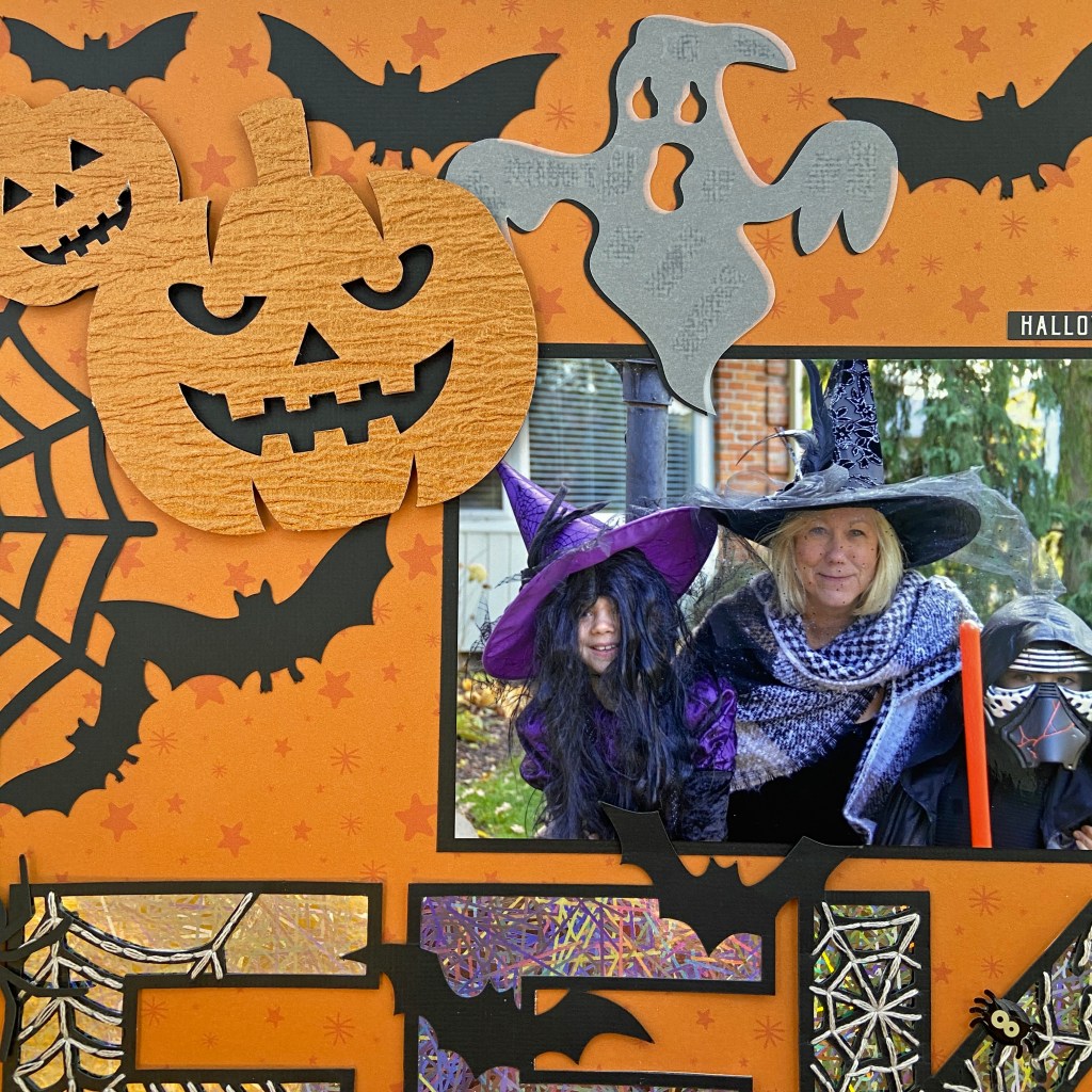 The large cut file at the top of the layout is entitled Halloween Corner by StudioIlustrado. It is also in the Silhouette Design Store (Design ID #65854). It was cut from black cardstock and the pumpkin eyes, noses, and mouths were kept to create a shadow effect. I choose to highlight the pumpkins and the ghost, leaving the bats flat on the page. This created continuity in the layout as the bats in both cut files appear to merge into one big cut file, encircling the photo. I used the knife tool in the Silhouette Studio software to isolate the ghost and pumpkins. This allowed me to cut the specific part of the cut file I desired, rather than having to waste paper by cutting out the entire cut file in another medium. The ghost was cut from vellum and adhered slightly offset with vellum tape. The pumpkins were cut from heavy orange textured cardstock and adhered with 3D foam squares by Scrapbook Adhesives.