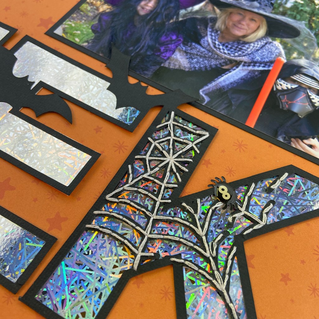 The title for the layout, EEK, is a Silhouette Design Store cut file by Jillibean Soup (Design ID #386850). I resized the file to make it a bit bigger and cut it out of black cardstock. I love creating layers, textures, and stitching on my layouts. The spider webs in the cut file provided the perfect backdrop for adding in some soft stitching. The first step was to pierce holes in the spider webs found in the letters E and K. The spider webs were stitched using three strands of light silver DMC floss (#762). To enhance the spooky feel of the layout, the title was backfilled using Lawn Fawn’s Metallic Cardstock in Holographic 2.0. Ranger’s Glossy Accents was used to adhere the stitched cut file to the holographic background.
