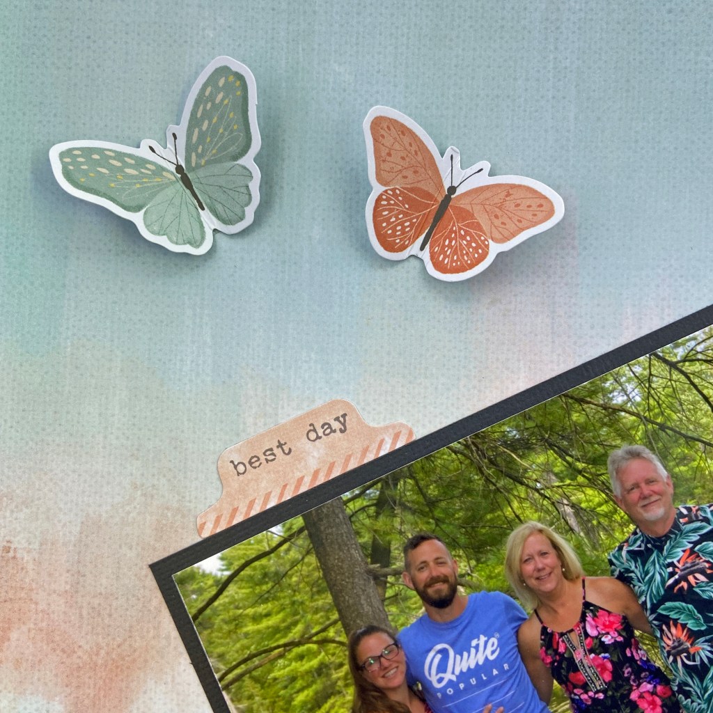 A selection of embellishments from the These Days Die Cut Ephemera package completed the layout. To create the dimension on the butterflies, I placed score lines on either side of the butterfly’s bodies and then gently folded the wings up. Scor-Tape was then applied in the thin centre channel to adhere the butterflies to the page.