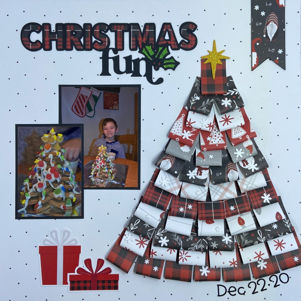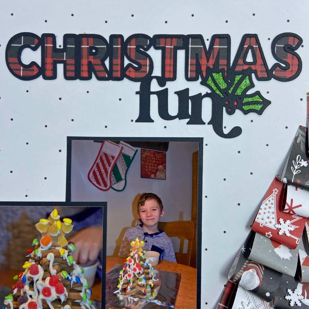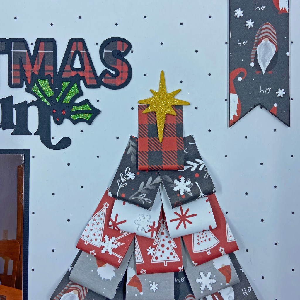 Once the picture and cut files were in place, the rest of the layout came together quickly. The cute woodland animals, gifts and branches (around the title) all came from the Joyful Die-Cut Ephemera pack. Gold-Glitter Puffy Stars, also from the Joyful collection, were used to embellish the top of each patterned tree. They are gorgeous fabric embellishments that add a lovely texture, dimension, and feel to the overall layout.