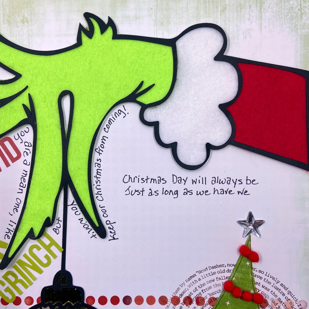 The background paper for this fun layout came from an older collection of patterned papers called Mistletoe by Bo Bunny. I used Sophie Gallo’s Christmas Grinchy Ornament cut file found on Etsy to create this layout. The Grinch’s arm and hand were created by tracing the outline of the cut file onto coordinating coloured felt and cutting by hand. I adhered it to the paper cut file using Ranger’s Glossy Accents. To complete the preparations on the cut file, I used glossy gold cardstock to back the top of the Christmas ornament. I used Silhouette Studio software to accurately size my photo to fit the hanging ornament before printing. Once these steps were completed, the cut file was adhered to the background paper using large Glue Dots. To further the whimsical feel of the layout, I placed my journaling around the Grinch’s fingers. To emphasize COVID and MR GRINCH, I turned to colour coordinating letter stickers from Simple Stories. The text reads: Dear COVID, you are a mean one, like MR GRINCH. But you won’t keep our Christmas from coming!