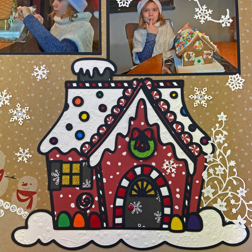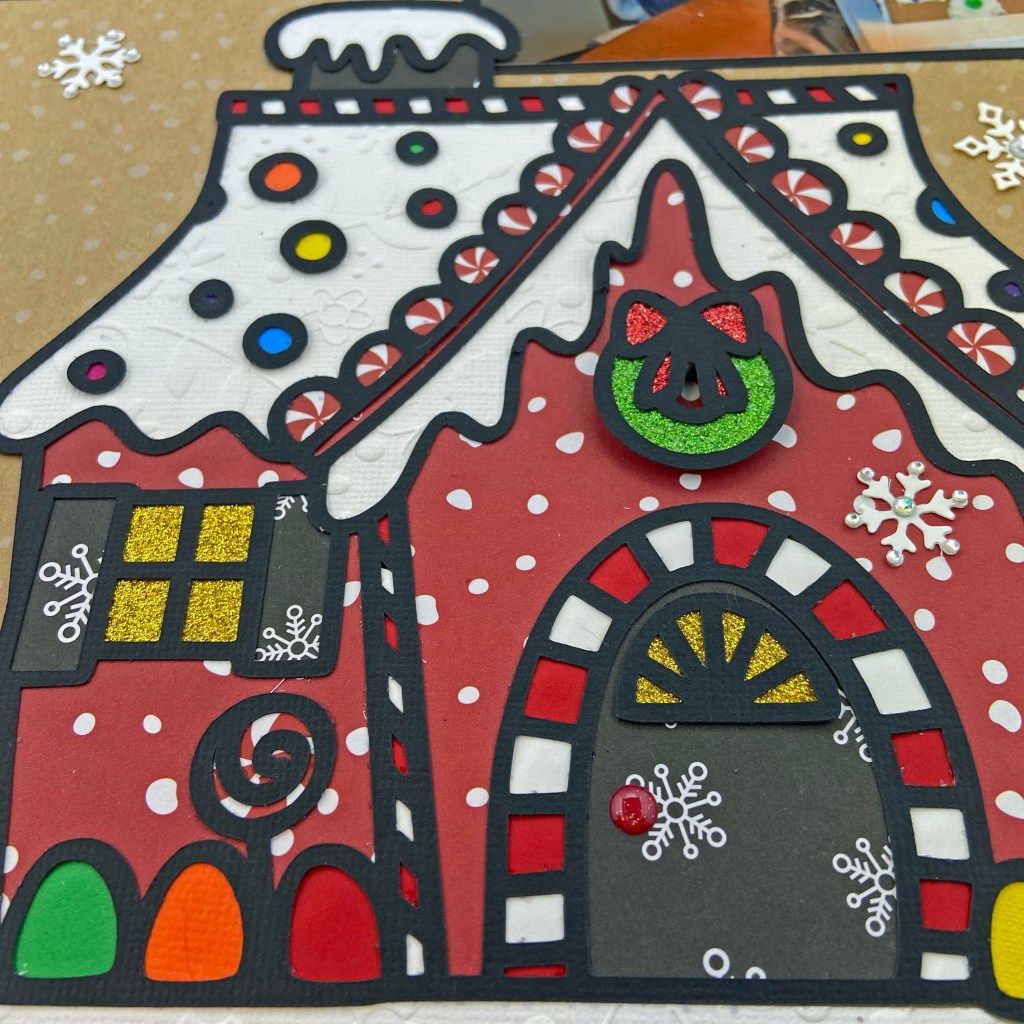 The main paper line for this layout is Hot Cocoa from American Crafts. It came in a paper pad of 48 papers. I used this paper collection in November 2019 to make a Christmas Album for a class at ScrapFest. It also has a whimsical feel and was an excellent fit for this cut file. I chose the kraft paper with the snowmen and falling snow for the base page of the layout. The red paper with snow falling, black paper with snowflakes and black paper with peppermint candies were all used to construct the gingerbread house cut file. I fussy cut the peppermint candies to fit the scalloped border of the roof and the pinwheel candy to the left of the front door. I chose an embossed white paper for each section laden with snow. I turned to glitter papers from My Favorite Things paper collections to back the windows and fill the wreath. For added dimension, I used pop dots to add the wreath to the front of the house. A red acrylic dot from doodlebug design worked perfectly for the doorknob.