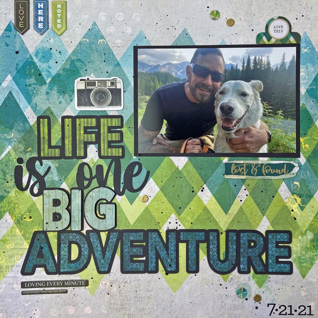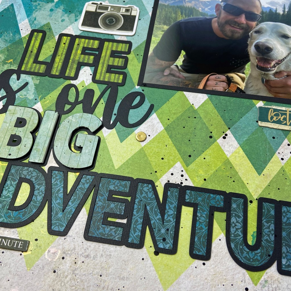 I used the Life is One Big Adventure cut file from Peartree Cutfiles for this layout. I chose three coordinating papers from the Fernwood collection to complete the title. I wanted a little texture in the title, so I backed the letters for the word BIG with double-sided adhesive foam and secured them on top of the cut file.