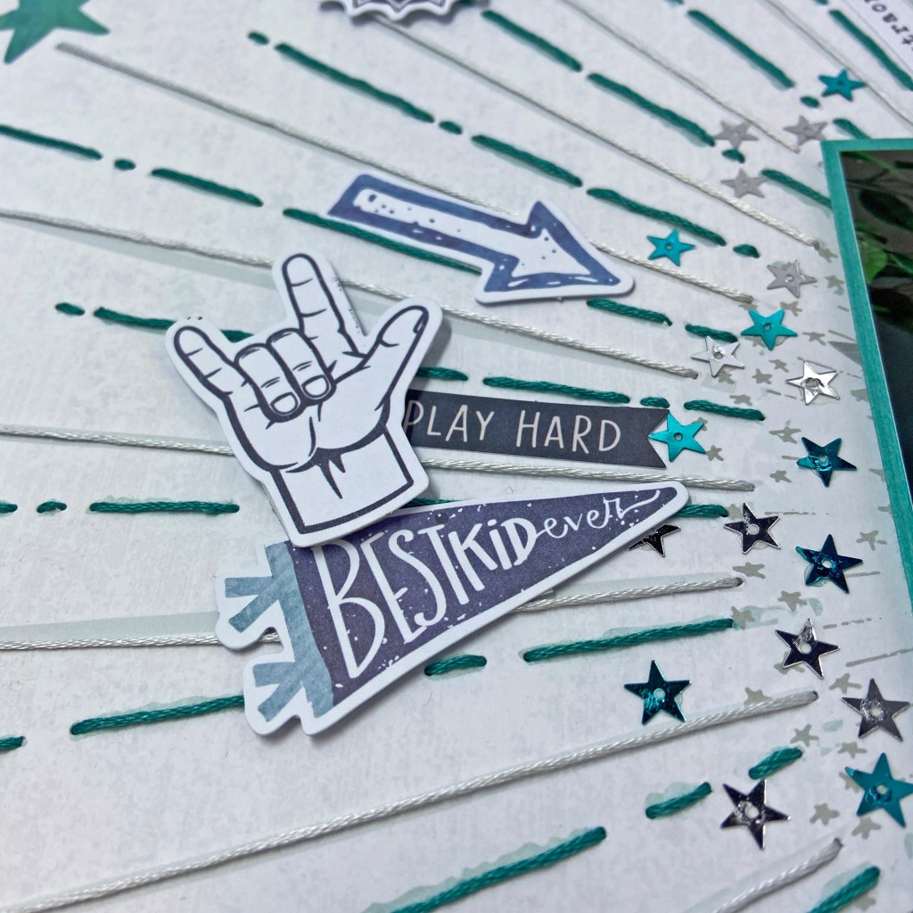 Once the stitching was complete, I added a random splattering of coordinating foil stars in teal and silver. The patterned paper had a ring of stars in this area, and I used the foil stars to highlight it and draw your eye to the picture. The picture was matted using teal cardstock and secured to a piece of fun foam for added texture and dimension before adding it to the layout.
