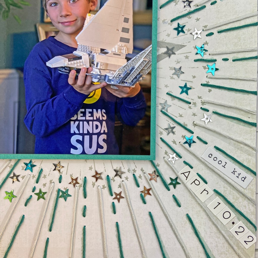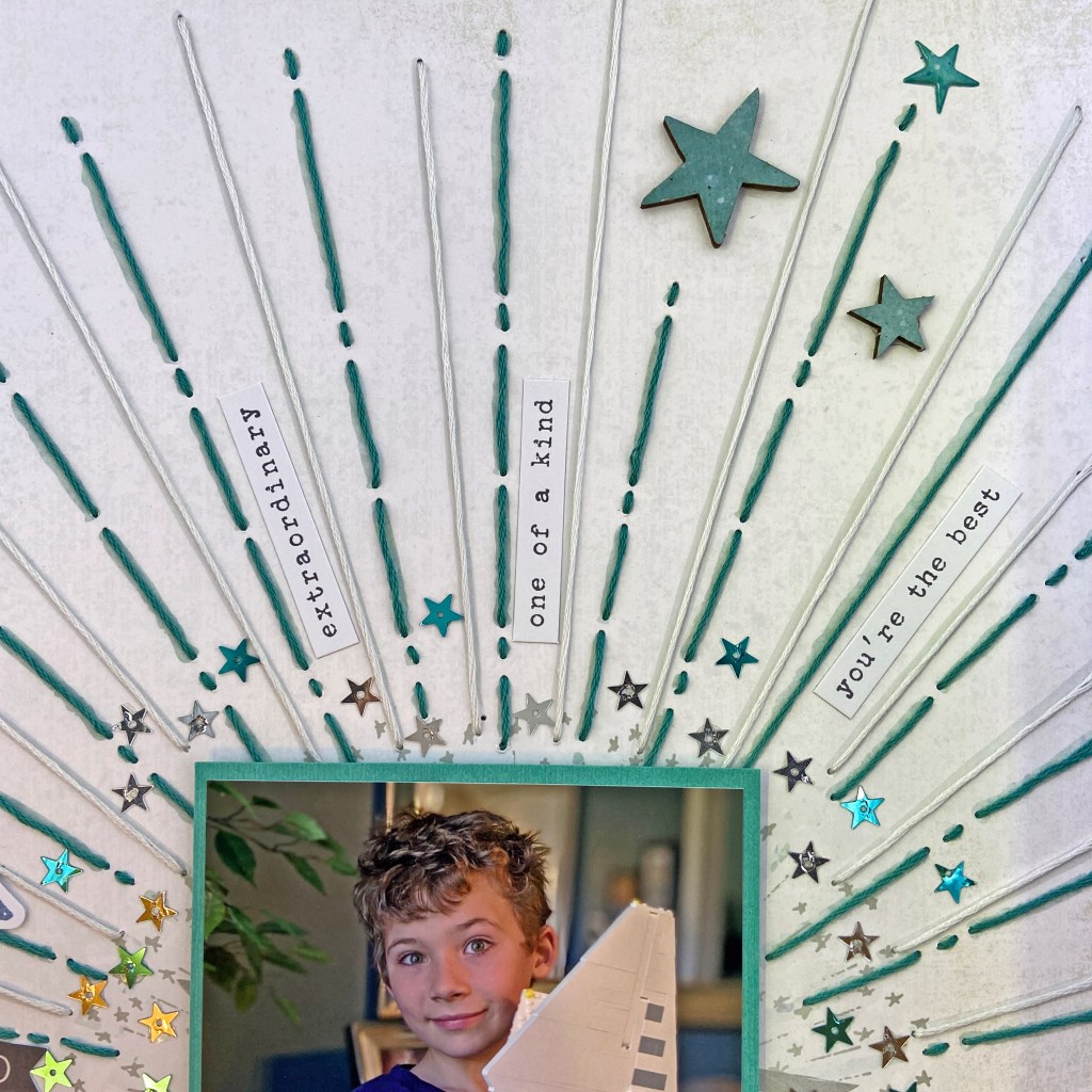 Big Bang is the name of the patterned paper base. I wanted to add texture and layers to the page, so I was inspired to stitch the rays on the page. Using a paper piercer to establish the start and endpoints of each line, I stitched them using coordinating embroidery floss. If a line reached the edge of a page, I wrapped the embroidery floss over the edge and secured it with tape. The embroidery flosses used in this layout were DMC 762 and 3848.