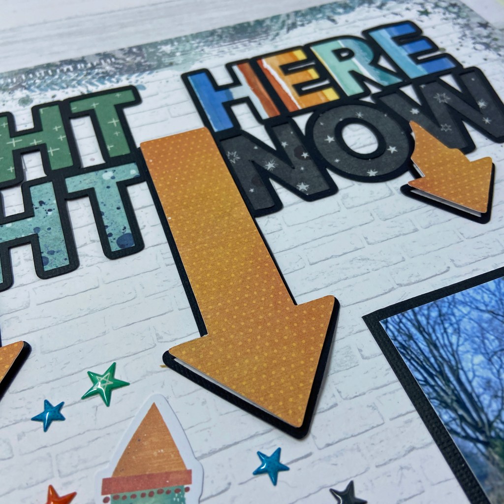 I backed the words in the cut file with four coordinating patterned papers (Stardust, Latitude, Nebula and Orbit) while I popped up the orange arrows (Spark) using fun foam. By doing this, I helped draw emphasis to the picture below.