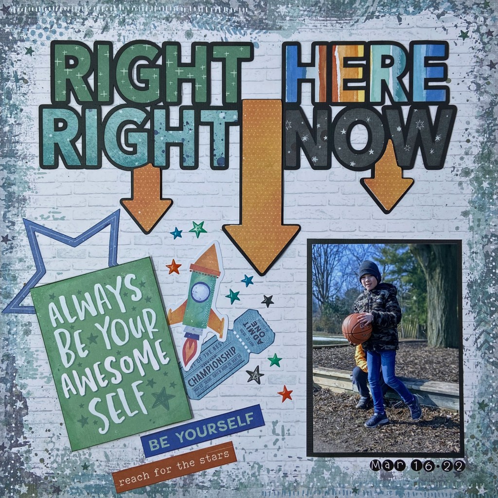 Do you remember the joy of Springtime and the welcome change of activities from winter? Owen wanted a basketball for his birthday and was thrilled when his wishes came true this year. I turned, once again, to Cocoa Vanilla Studio’s No Limits collection to document this special moment. I love how the colours in the photo work so well with the colours in this collection. The background patterned paper for this layout is called Spark.