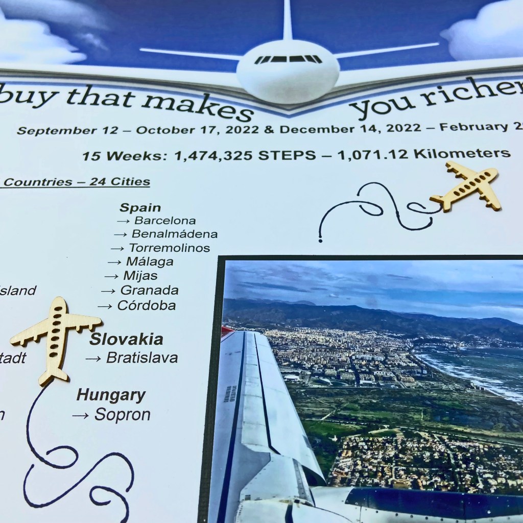 It feels good to be back in my scrapbook room creating again, and this layout seemed the logical place to start sharing with you. It was inspired by my Aunt who asked “Do you know how many steps you’re taking on these journeys?” That question got me thinking, and when I was back home I sat down with an excel spreadsheet and my fitness tracker to figure it out. We were constantly on the go, taking advantage of every day and opportunity while we were overseas. However, I had no idea we had logged over 1,000 kilometres and almost 1 & 1/2 million steps! Of course, I had to scrapbook this accomplishment and include the beautiful places we visited during our travels.