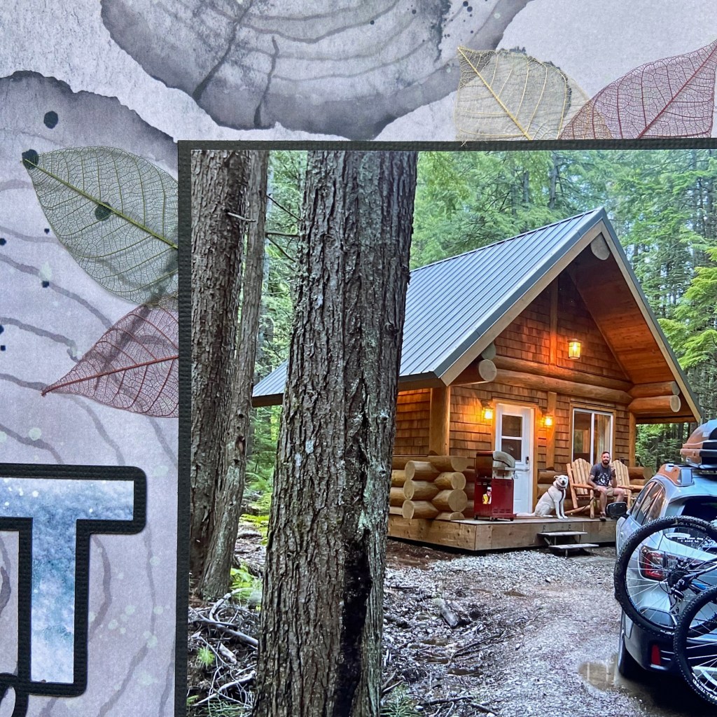 I am so honoured to have a couple of layouts published in the Summer 2023 edition of Creative Scrapbooker Magazine! If you don’t subscribe, be sure to get a copy. This magazine is chock full of inspiration! This layout (found on page 122) is very special to me. It marked the official beginning of my son’s and his wife’s honeymoon last summer. They are avid campers and they headed to the mountains to decompress following their wedding. This little cabin in the woods was a perfect getaway for their first few nights away.