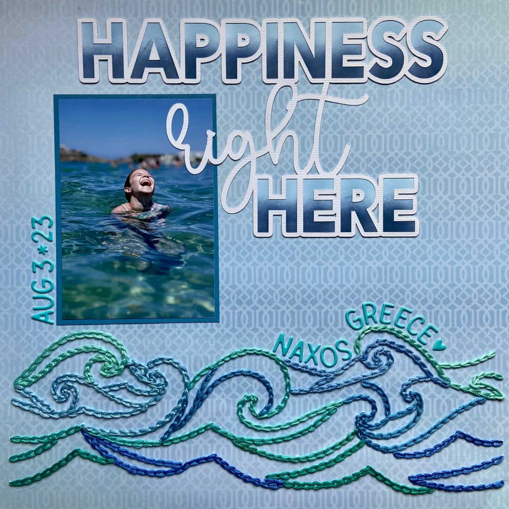 Oh, the pure bliss of swimming! And what could be better than swimming in the South Aegean off Naxos, Greece?! My daughter, son-in-law, and family vacationed in Naxos this summer; as you can see from the picture, it was a huge hit! Madison has always been a water baby, so this vacation was right up her alley. When I saw this picture I knew it was the perfect match for the Happiness Right Here cut file from Peartree Cutfiles. Peartree is celebrating its third birthday this month, and this cut file is free for the month of August. You can find the free version here. Come play along with the birthday celebration!