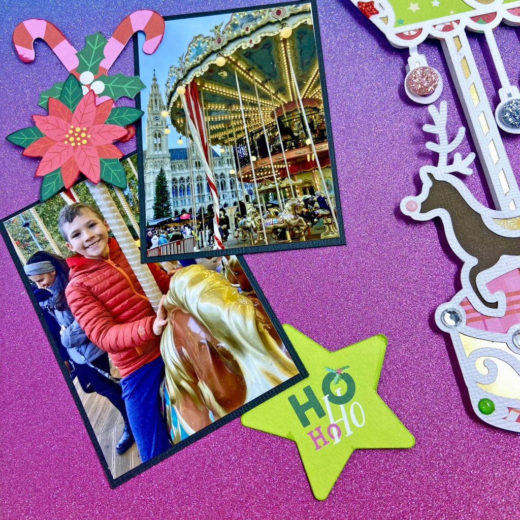I am thrilled to share with you my second layout as a Guest Designer for Paige Evan’s 25 Christmas Cut Files! Paige’s Carousel cut file was perfect to help me document this wonderful moment. This cut file is part of the 25 Christmas Cut Files released this year. It can also be purchased separately in Paige’s shop at https://bit.ly/digitalcutfiles. To start this layout I cut the file from white card stock and backed it with several patterned papers from the Sugarplum Wishes collection.