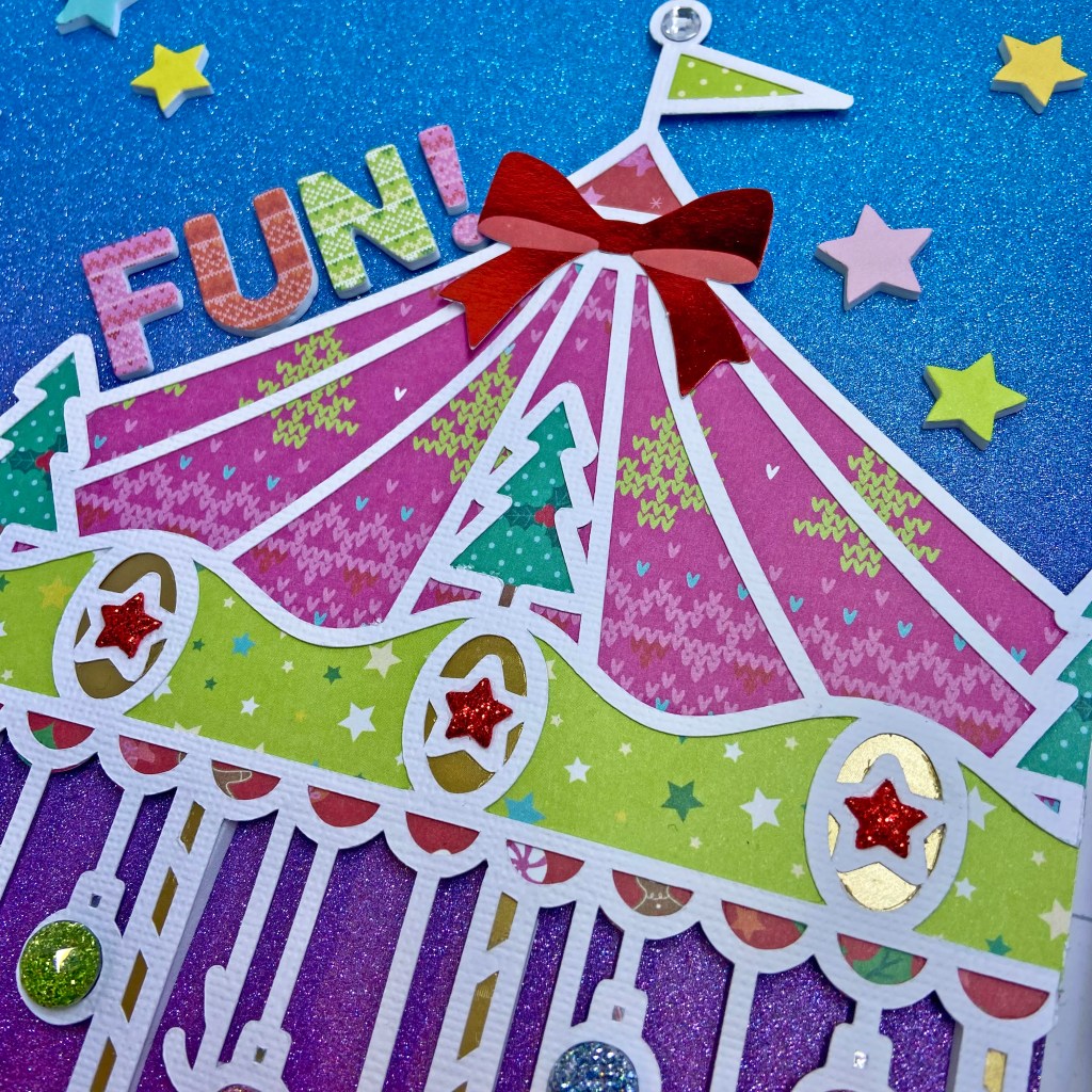 The trees at the top of the carousel were fussy-cut from paper #11. They fit perfectly in the canopy. I included a bit of gold foil cardstock for the star medallions, pony poles and at the base of the carousel. Once I completed this step, I placed the cut file on my background paper and offset it slightly to the right. After trimming the cut file on the right, I adhered fun foam to the entire back to help lift it off the page. This technique aided in the illusion of being able to jump on the carousel. The stars adorning the canopy and at the base of the carousel were cut from red glitter fun foam.