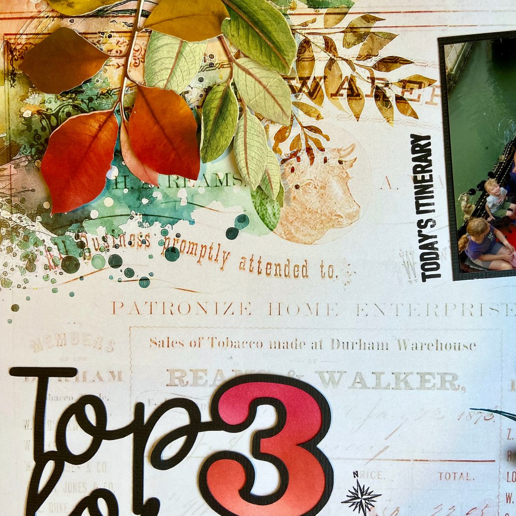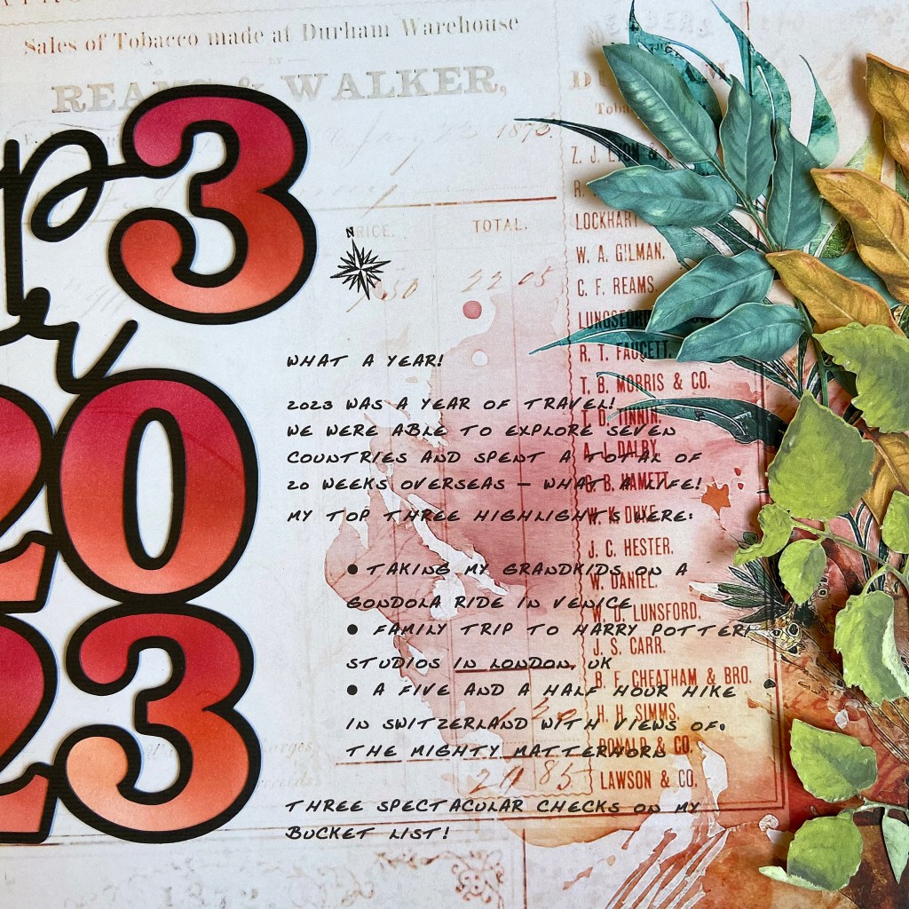 The gorgeous patterned paper for this layout belongs to the Artsy Print collection from Paper Rose Studio. The Top 3 for 2023 cut file from Peartree Cutfiles was an excellent choice to summarise our past year.
