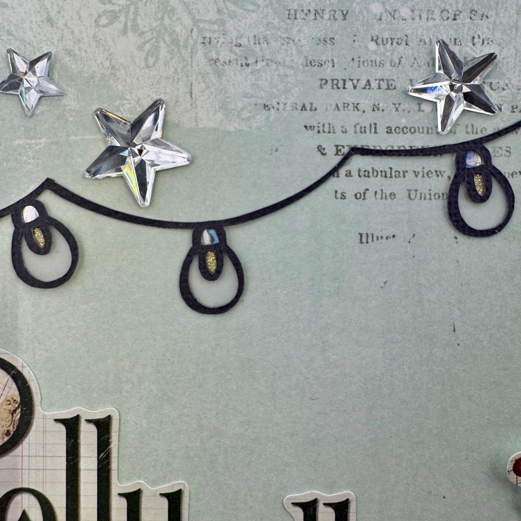 I cut off the upper edge and loops of the design to achieve a more accurate likeness to the photo. I cut two copies of this file to reach the 12′ Garland length. I used silver cardstock, light gold cardstock, and vellum to complete the lights. Next, I added a few silver stars above the lights to enhance the feeling of the evening.