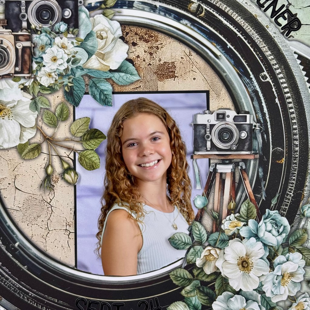 I kept this design reasonably simple. I did not want to distract from the gorgeous patterned paper and oversized lens, which I feel draws your eyes directly to my granddaughter’s beautiful photo.