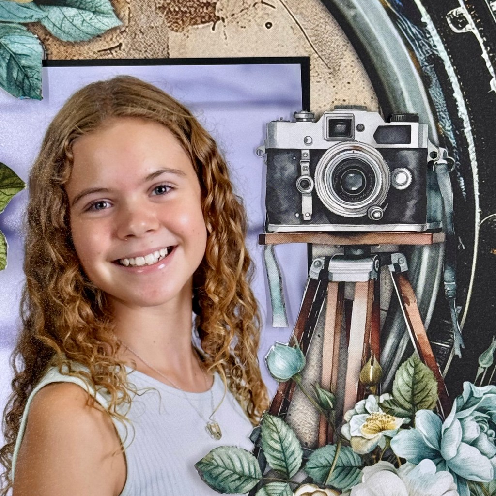 Happy Birthday to our oldest grandchild! Maddie turns 14 today! Where has the time gone? This young beauty is in her last year of German/English Junior High School in Wiener Neustadt, Austria, and I created this layout to document her school picture. The last two and a half years have been a lot of work for her. Not only was her family uprooted from Canada and their family and friends, but she was also required to learn German to be successful at school. They say a picture is worth a thousand words. You’d agree that this picture speaks volumes to her happiness and success. We couldn’t be happier or prouder of all her accomplishments in such a short time. Well done, Maddie!
