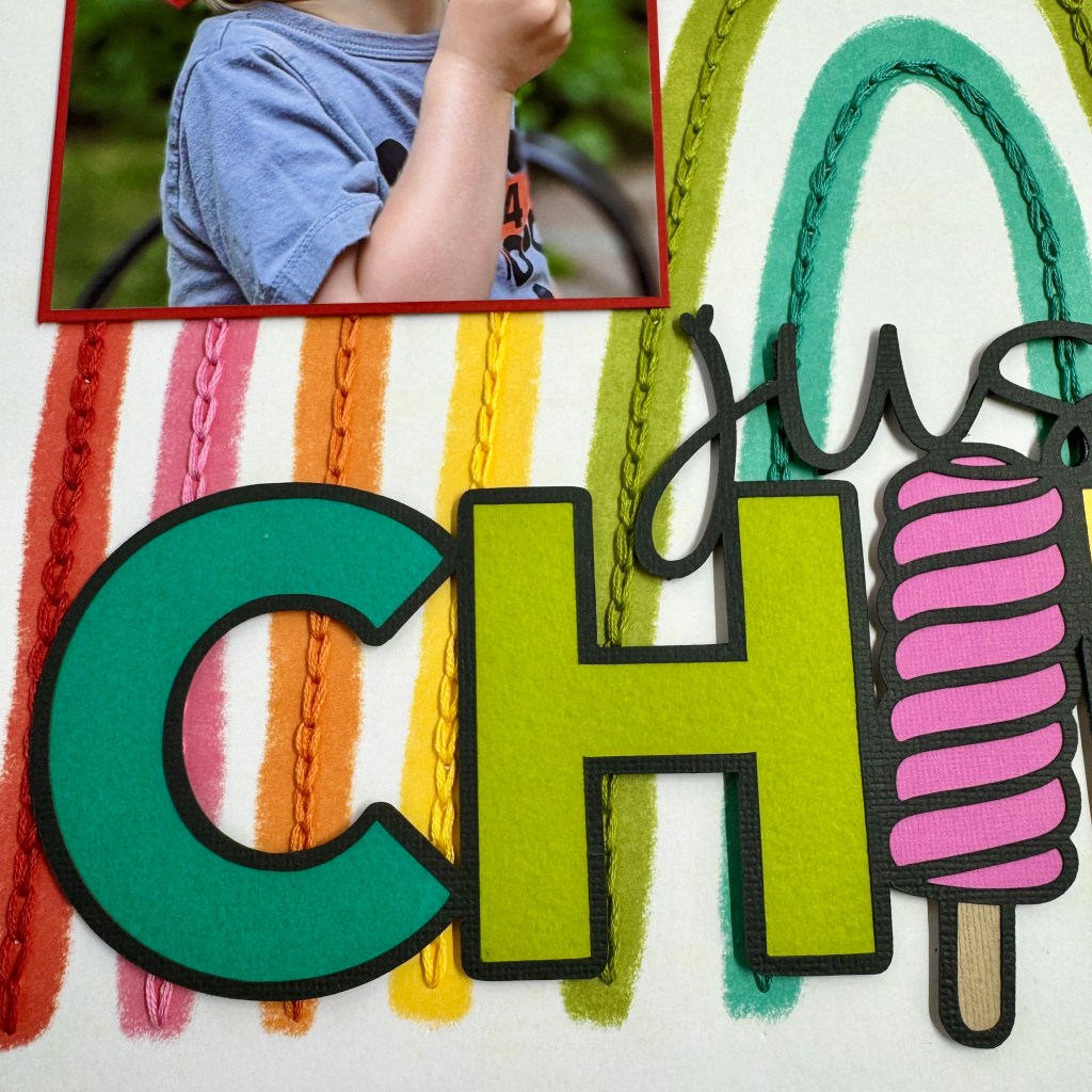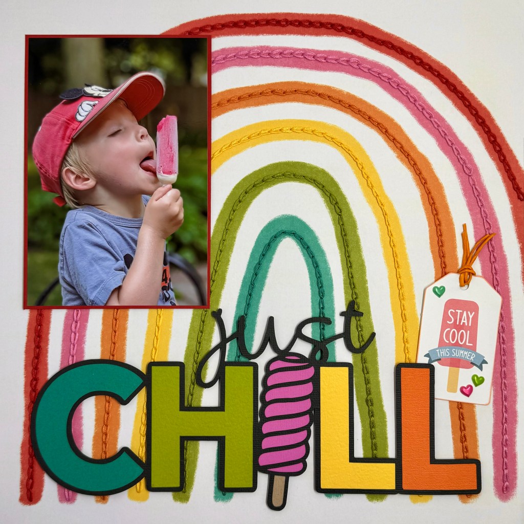 I used a Peartree cut file “Just Chill“, from the June 2025 Pearscriptions files, as the inspiration to document this fun picture of my youngest grandson. I paired the cut file with patterned paper (Bright Side) from Cocoa Vanilla Studio’s Sunkissed collection.