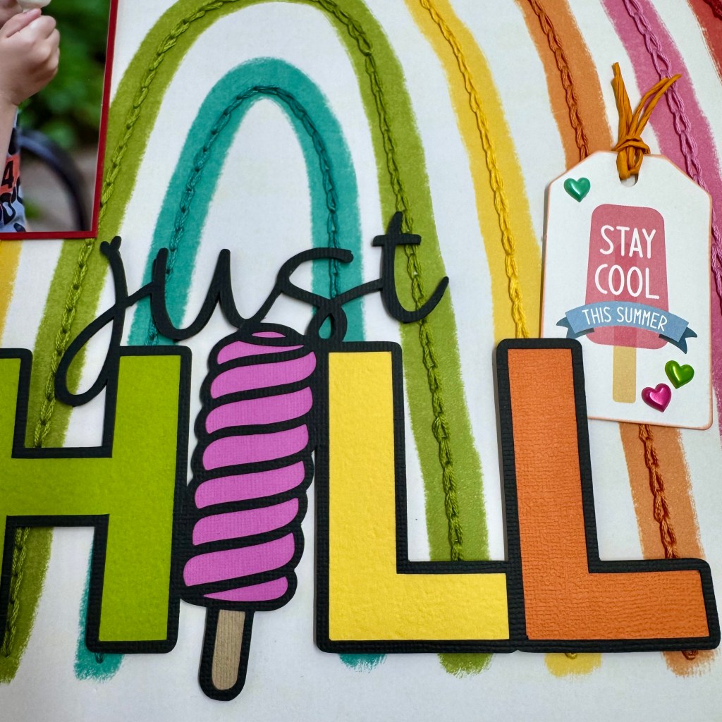 I was looking for a bright and whimsical feel to this layout, so I backed the letters and shape in the cut file with coordinating colours of Bazzill cardstock to mimic the colours of the rainbow. To create additional dimension and texture, it was adhered to the layout using double-sided fun foam. The final element of interest was the addition of the ‘Stay Cool This Summer” tag. This tag is from Echo Park’s “Here Comes The Sun” Frames & Tags set of ephemera. It was a generous donation from Scrap ‘N Stamp to our crop bags at ScrapFest in Kitchener this past April. The orange twine at the top of the tag is Marigold Twistel. It comes from Making Memories and has been in my stash for at least 20 years. The cute colour-coordinated hearts on the tag come from a sticker sheet by Reflections, purchased at Michaels.