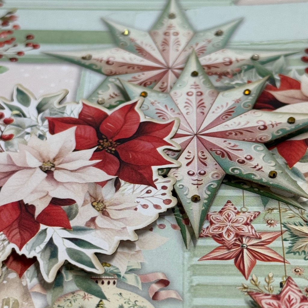 To reinforce the page title with a sparkle reference, I adorned the star ornaments at the top and bottom of the page with miniature gold gems from Spellbinders. These gems came in two tones, and I utilized both on the ornaments. The Christmas tree at the bottom of the page also had a star on its top, so I added a bright silver star from my stash to complete the sparkle elements. These gems and sparkles help enhance the Christmas tree lights in the picture.