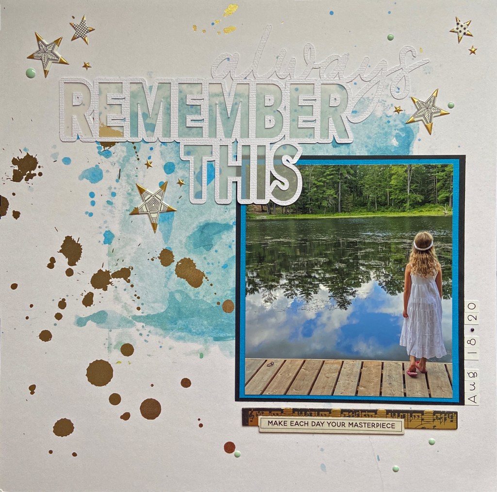 The title, Always Remember This, came from Peartree Cutfiles. I wanted the title to compliment the feel of the picture and the beautiful paper. To achieve this, I backed the open letters with vellum to allow the colours in the background to pop through and to assist in keeping the overall balance of the layout. You can find the cut file here: peartreecutfiles.co.uk/product/always-remember-this/
