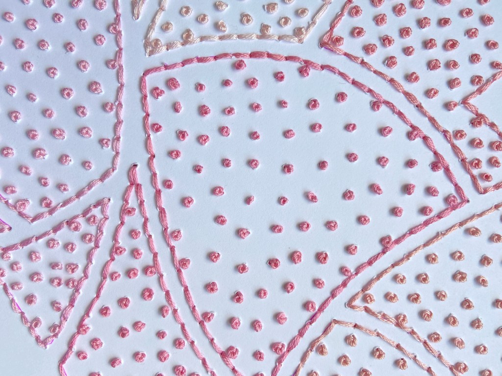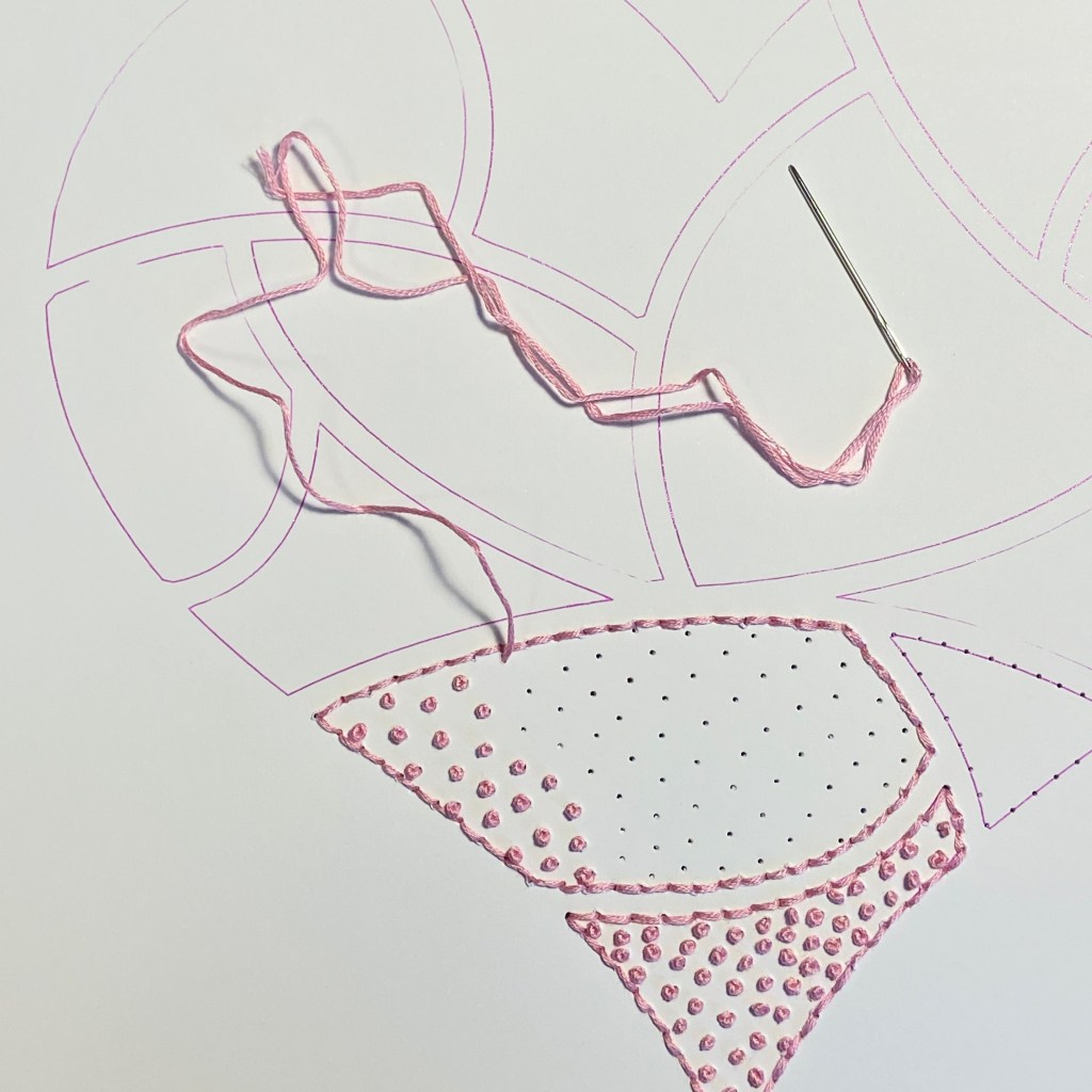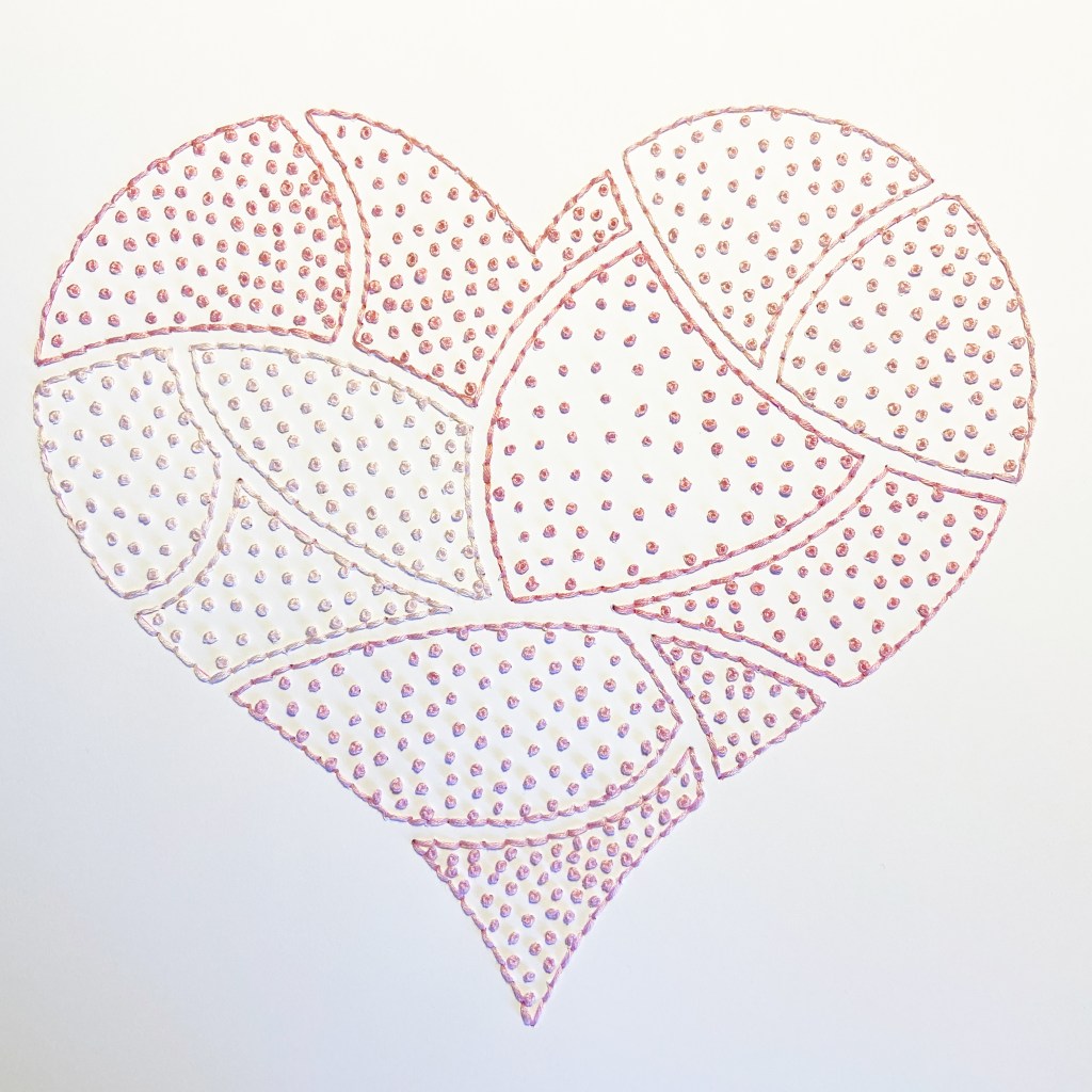 I knew I wanted to stitch a heart as the focal point of my layout. My vision included filling the heart with lots and lots of “love knots” – tiny stitches that almost resemble small roses. Paige Evan’s “Split Heart” pattern was perfect for my design. You can find it in the Silhouette Design Store (Design ID 284925). Instead of cutting the design, I used a sketch pen to trace the pattern directly on the cardstock. Using a paper piercer, I manually punched holes around the edge of each heart section, and then punched holes inside for the love knots. I used 5 different shades, and all six strands of pale DMC floss to stitch the completed heart (DMC 689, 604, 761, 818, 3326). I’m not going to lie – this took hours to accomplish, but I broke it down over several days to make it more manageable. Here’s a few pictures of the progress stitching this huge heart.