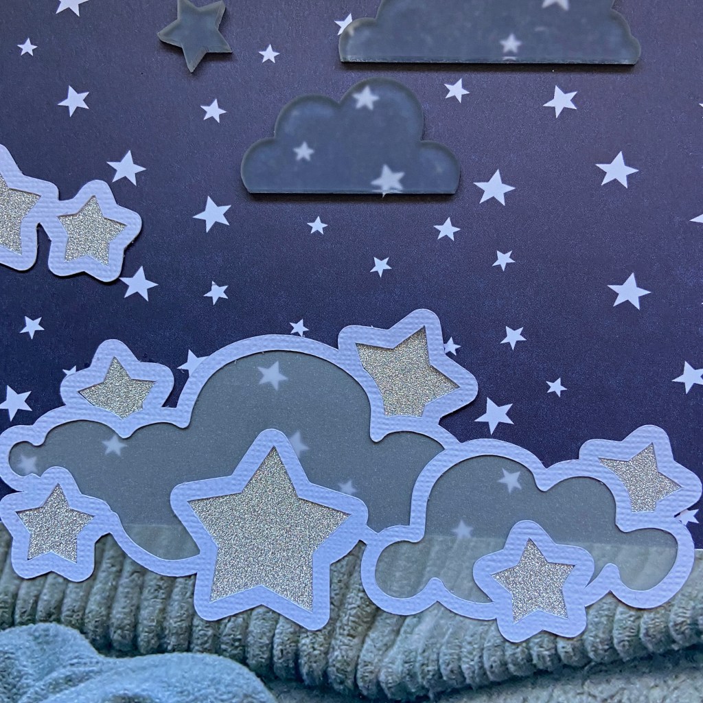The stars on the cut files were backed with silver and gold glitter cardstock and the clouds were backed with vellum for a light and airy feel. I also found some acrylic shapes in my scrapbooking stash from Shimelle. They fit in perfectly and also complemented the light and airy feel I was looking for. I usually look for ways of adding a title in an unusual way to a layout. The large 12′ x 6″ photo provided the perfect opportunity to place a title. With the photo occupying centre stage on the layout, I wanted something subdued for the title. Pinkfresh Studio’s Mimi Puffy Alpha Stickers in grey were exactly what I needed to achieve this effect. Here are a few closeups of this project.