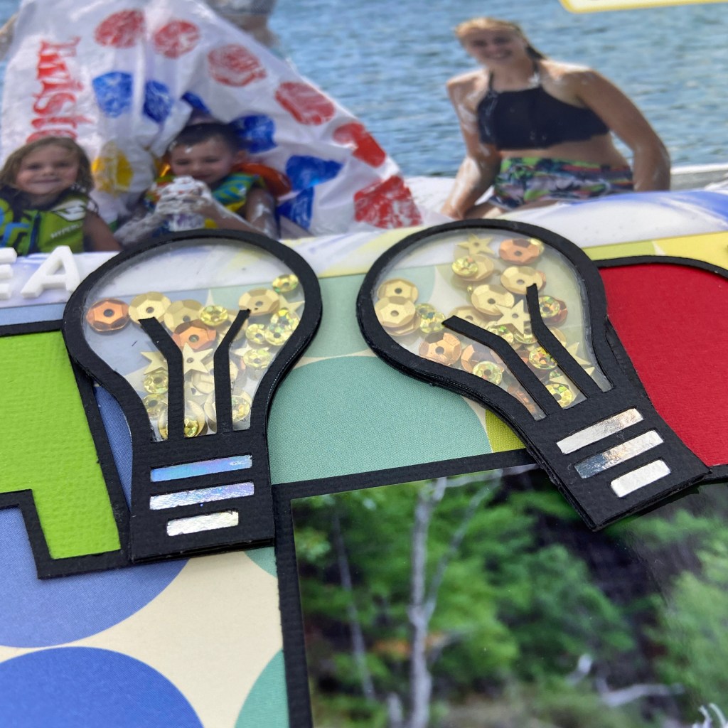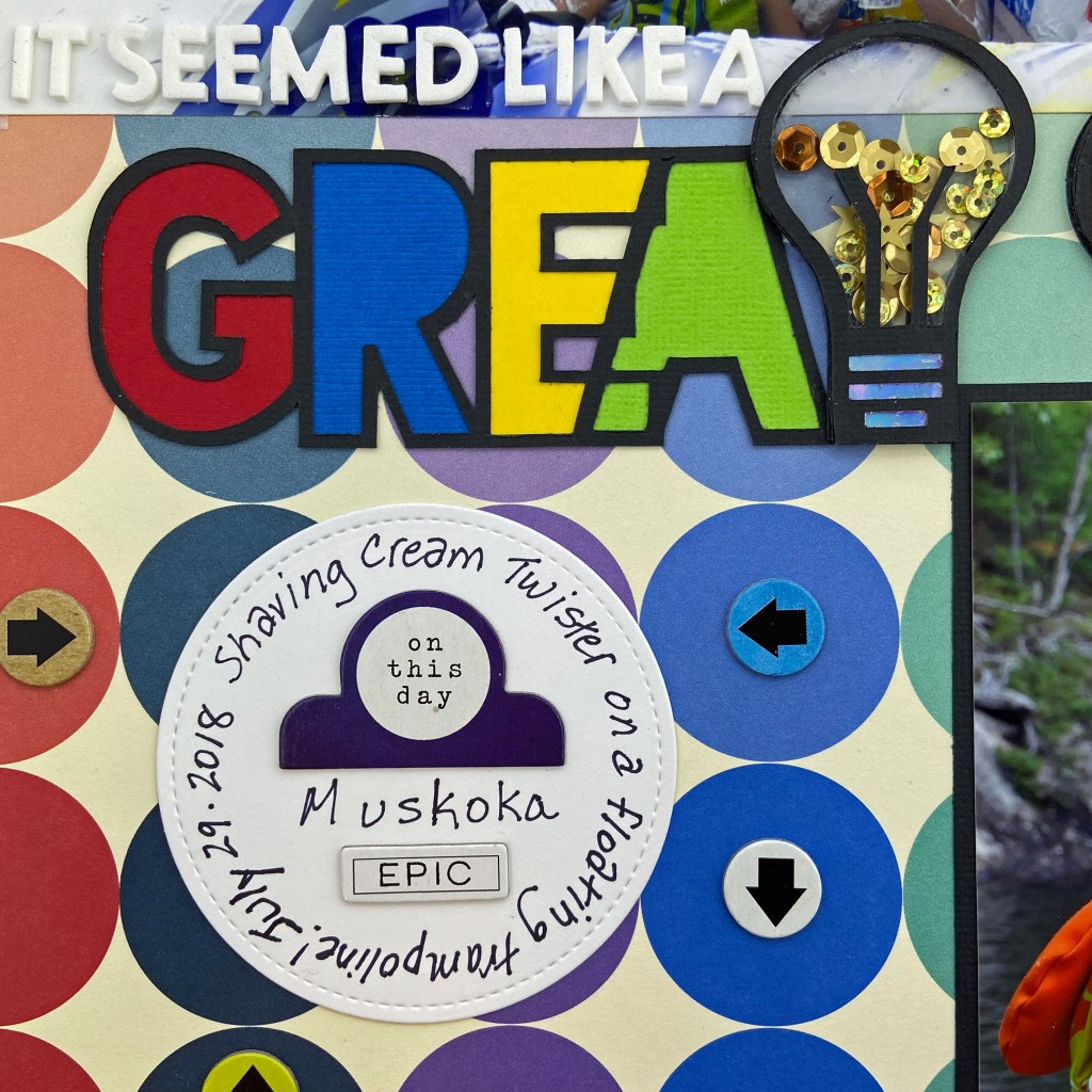My second Design Team layout for Marcy Milly SVG is designed around the Great Idea cut file. When I first saw this cut file, so many ideas and possibilities went through my head. I love the light bulbs in this title and knew instantly that I could turn them into shaker boxes. As I pondered different ideas I was drawn back to this fun day in July 2018 when these cousins got together for some fun. Of all the games they played that day, the Shaving Cream Twister, on top of a floating trampoline, was the best!