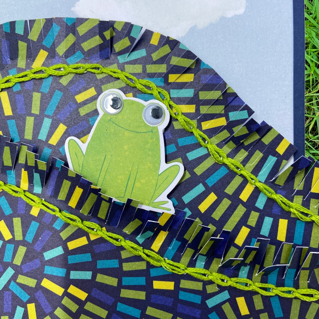 The layout was completed by adding the two butterflies and the frog from the Never Grow Up ephemera package, and the Go Play Outside title from the coordinating Let’s Play Foam and Cardstock Phrase Stickers by Thickers. The butterfly on the far right has a few small pop dots underneath to give the illusion of flight. The frog was secured with fun foam for dimension, and two googly eyes were attached to add to the whimsical element.