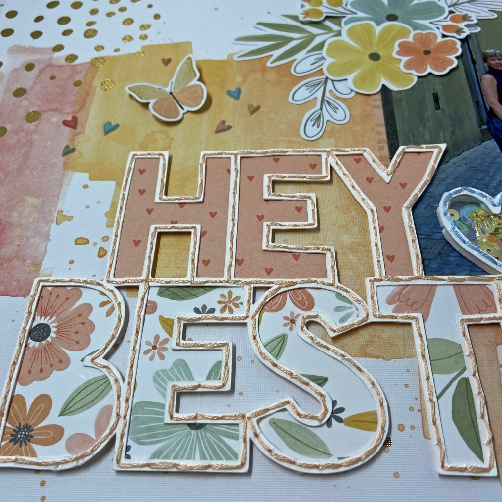 I used the Hey Bestie cut file from Cut to You as the centrepiece for this design. The cut file was cut from white cardstock and then pierced with a paper piercer to allow a stitched border.